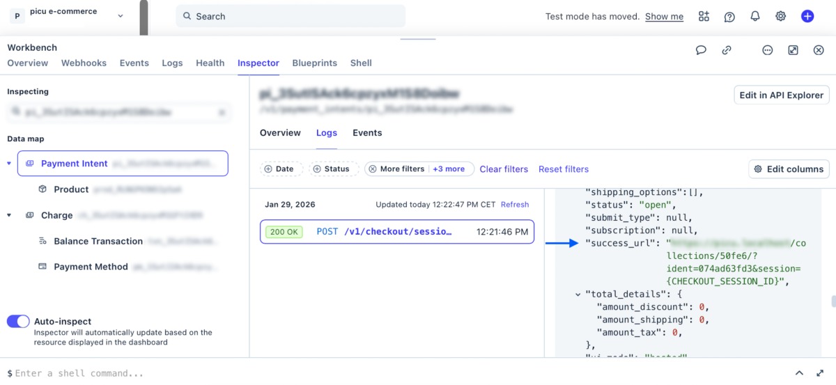 - Logs should open in “Workbench“. Click on a POST event in the list to open the Log’s details. Scroll down until you see “success_url” and “cancel_url“.